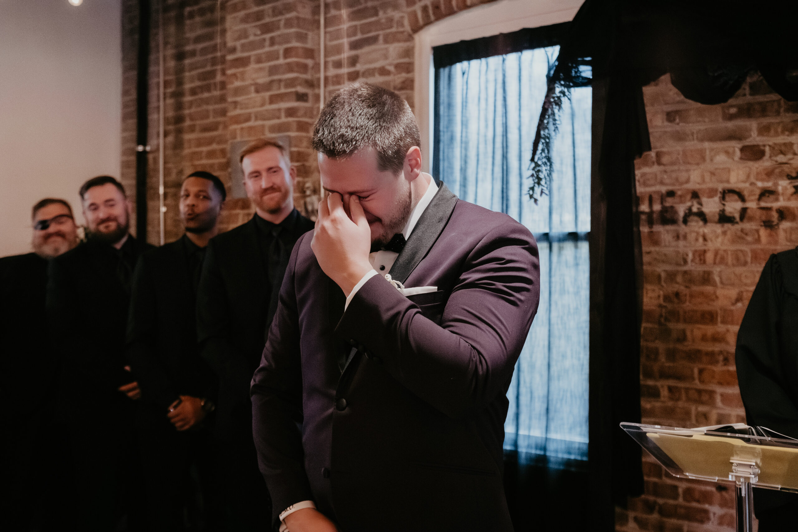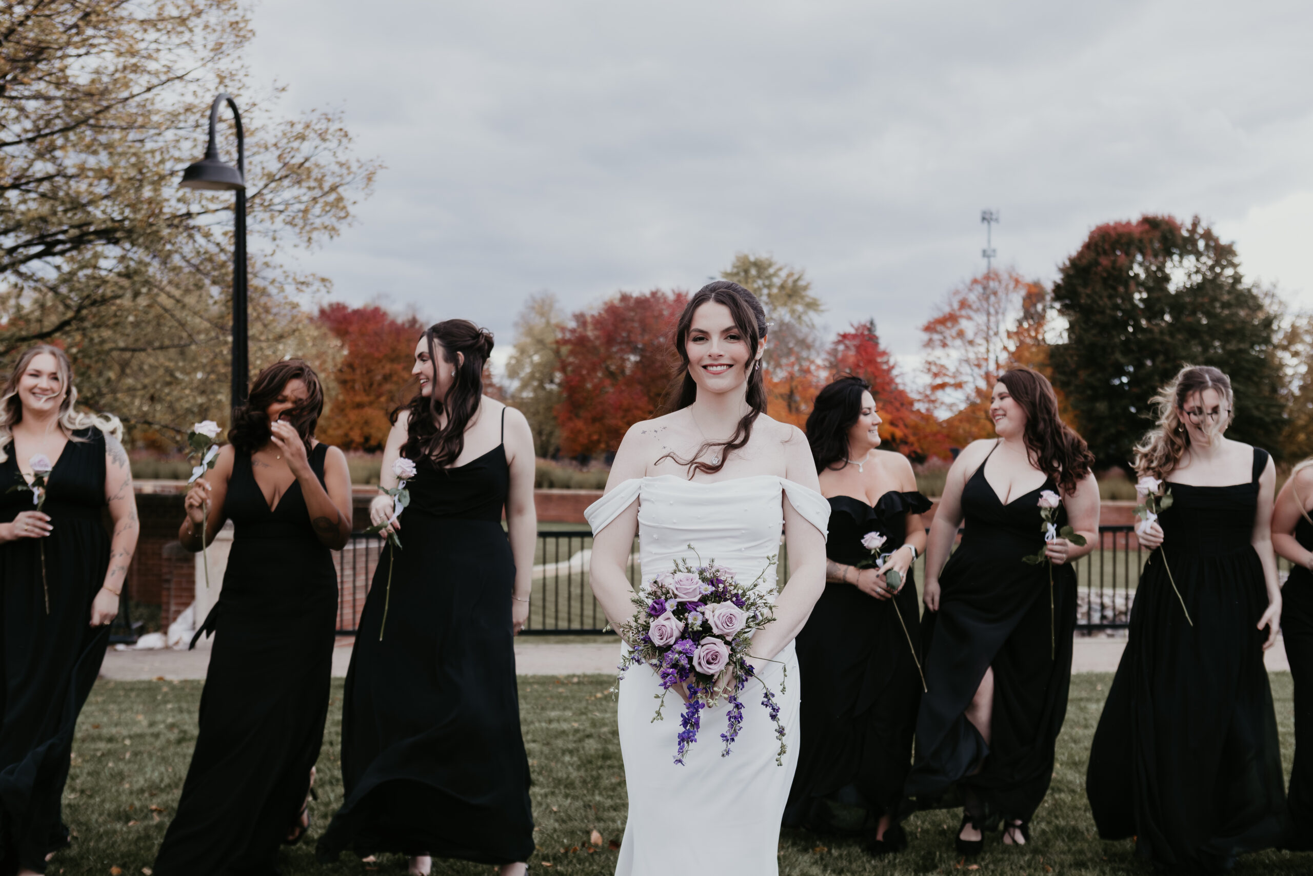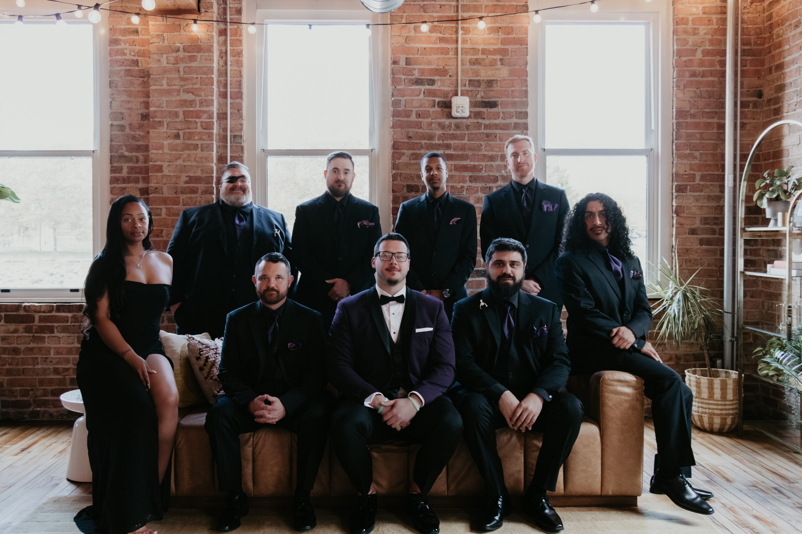 The wedding party tied the look together seamlessly. Bridesmaids wore flowing gowns from AZAZIE that complemented the moody color palette, while the groomsmen, dressed in Men’s Wearhouse suits, added a polished touch to the night’s atmosphere.