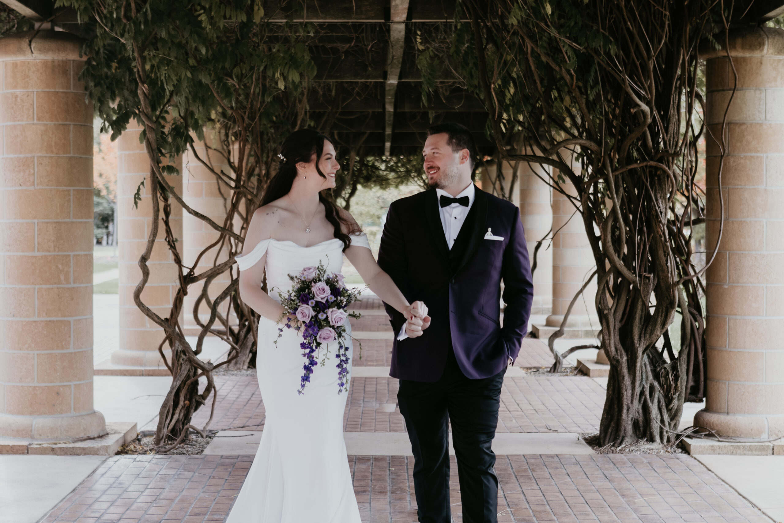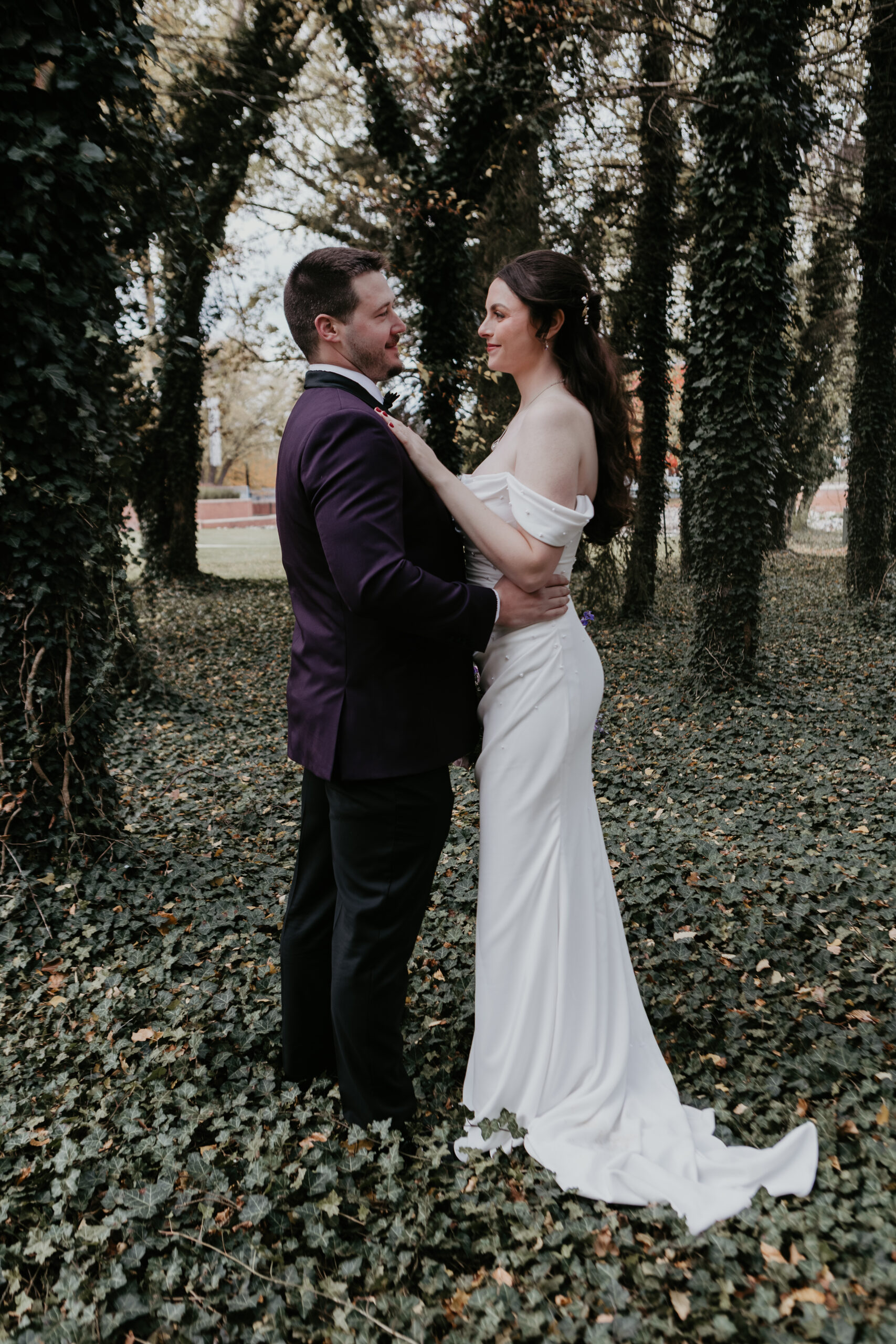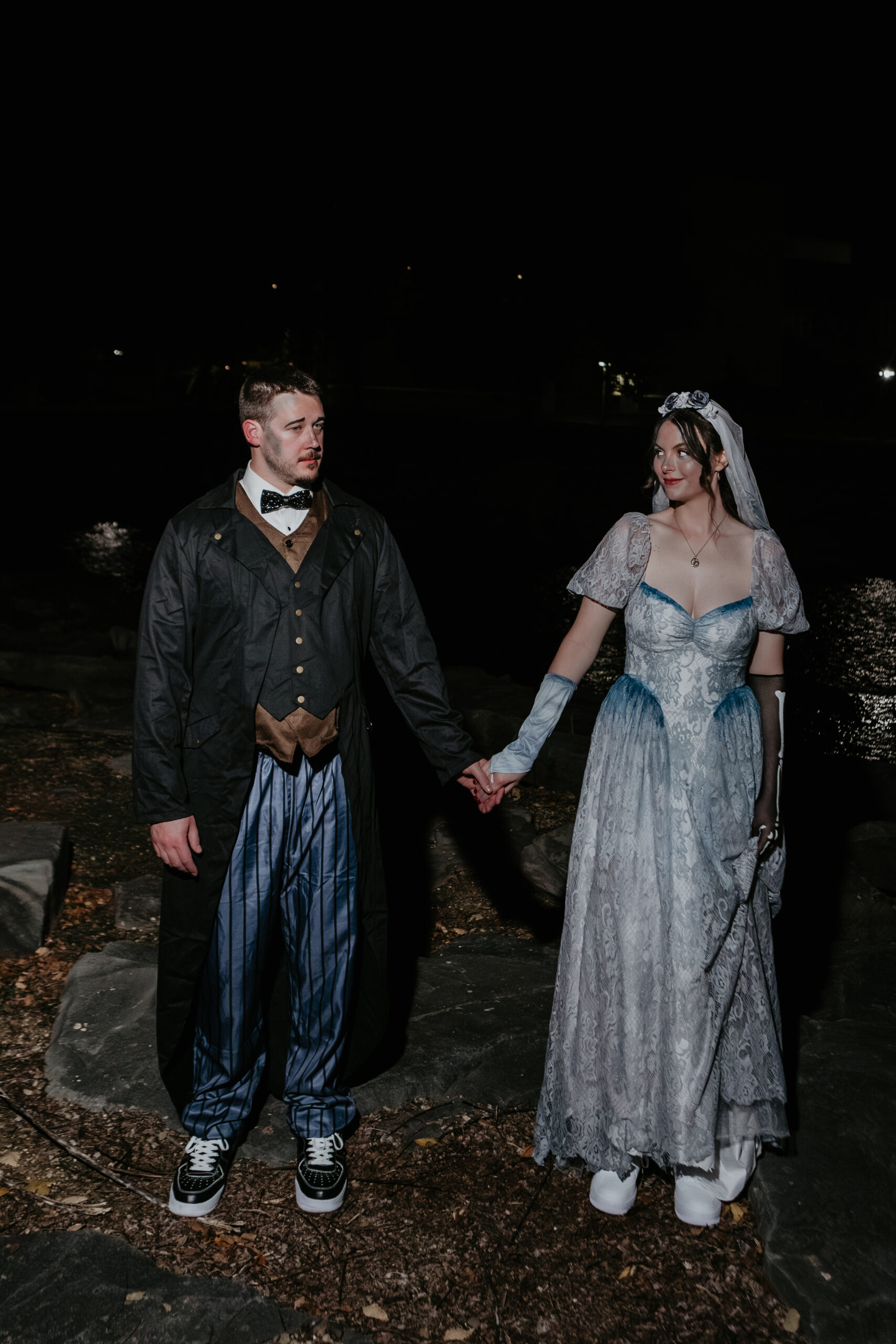 Elyse stunned in her gown from Becker’s Bridal, a fitted off-the-shoulder design that radiated timeless beauty. Her hair, styled by Aleshia Rose Hair Design, framed her face in soft waves, and her makeup by Tori Sides brought the perfect balance of glam and grace. Murphy wore a tailored tux from Sam Michaels Tailoring & Tuxedo, the sharp details and deep tones perfectly complementing their Halloween aesthetic.