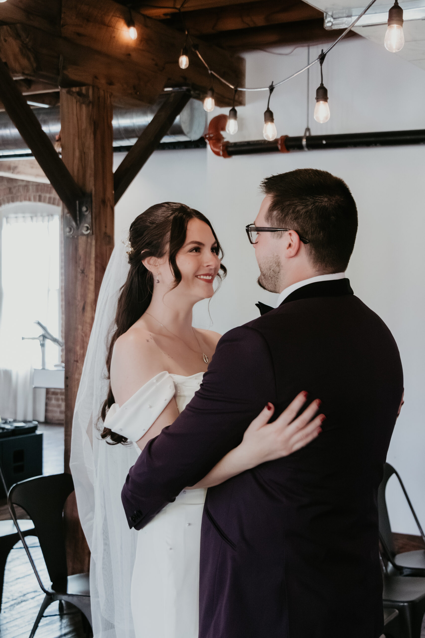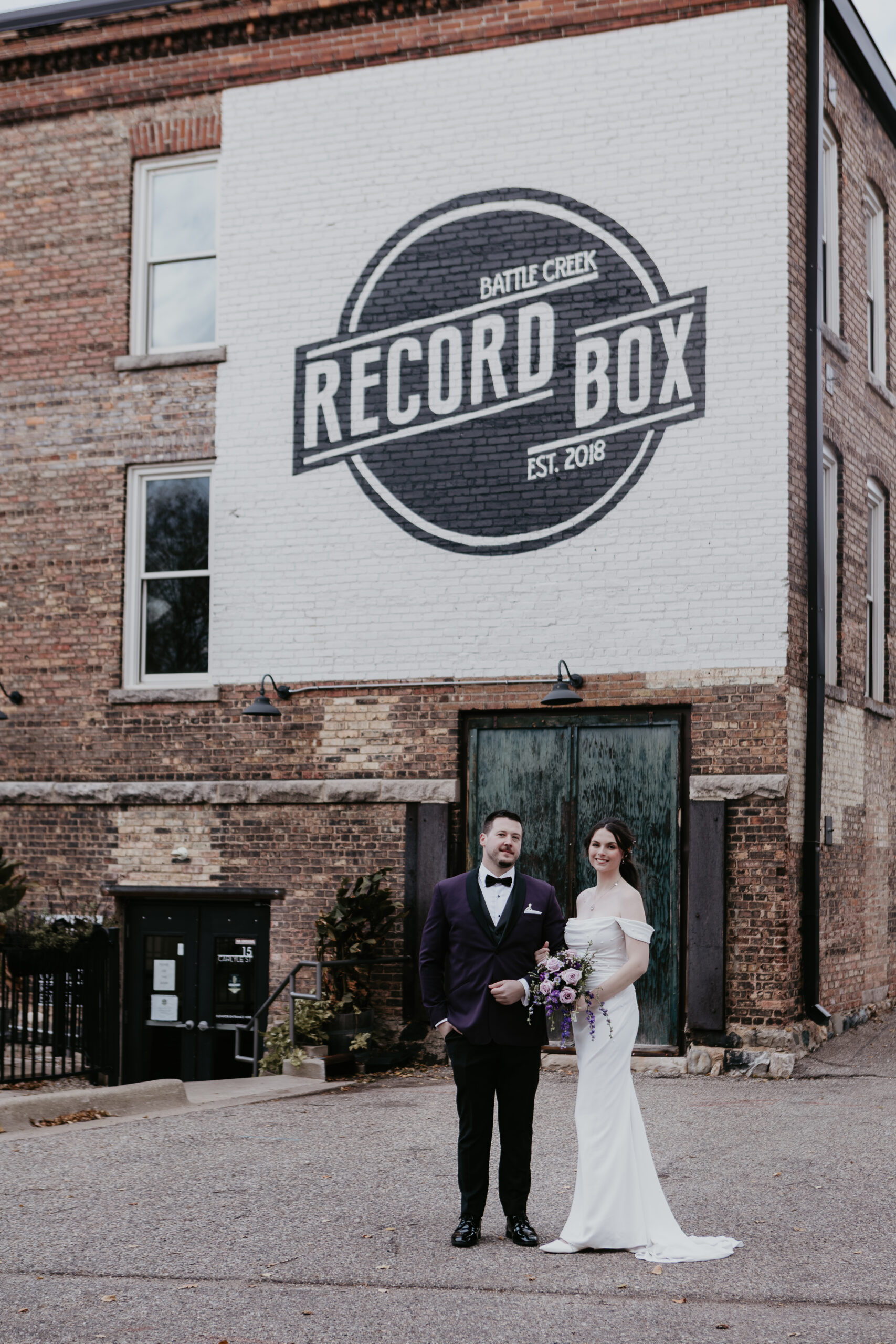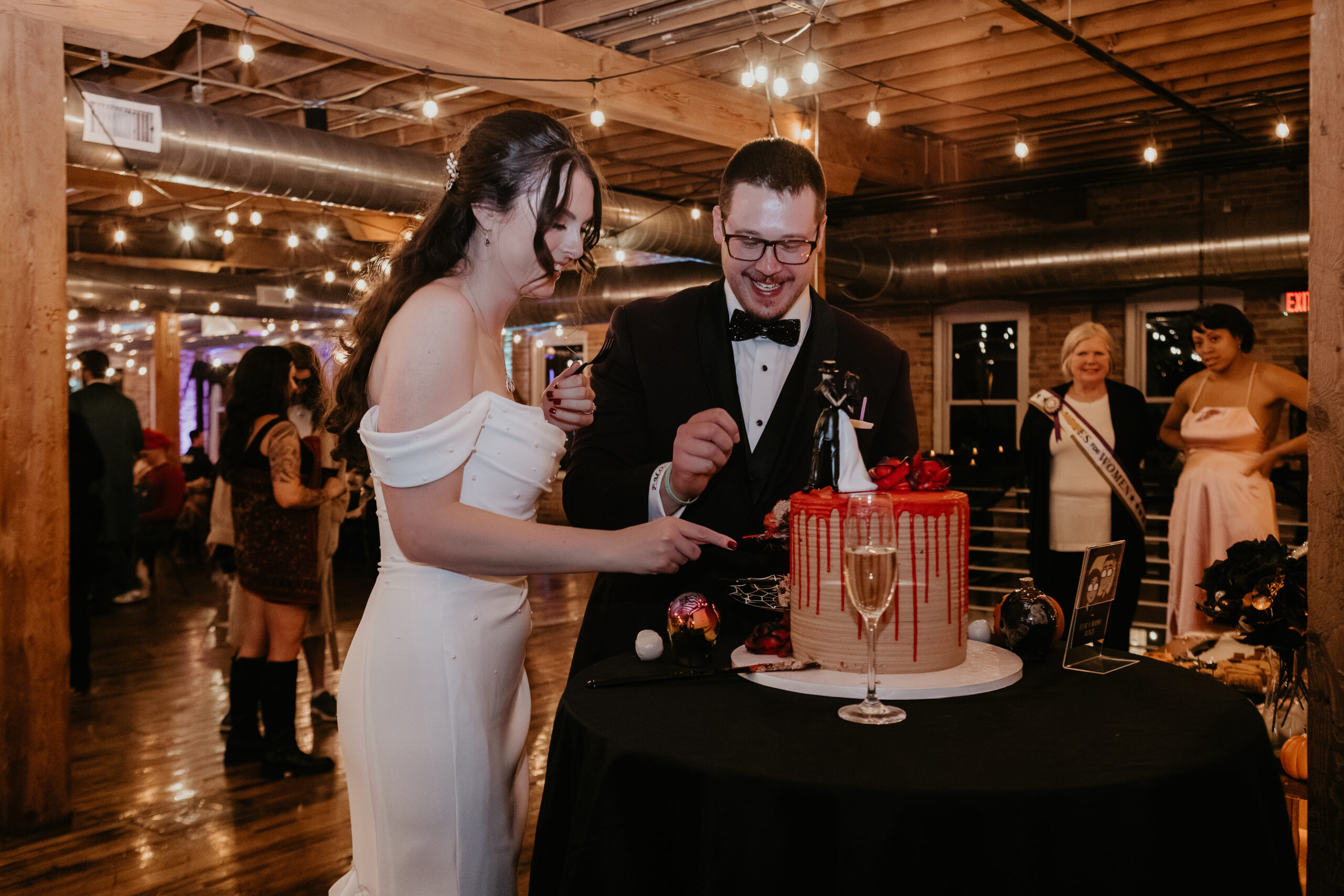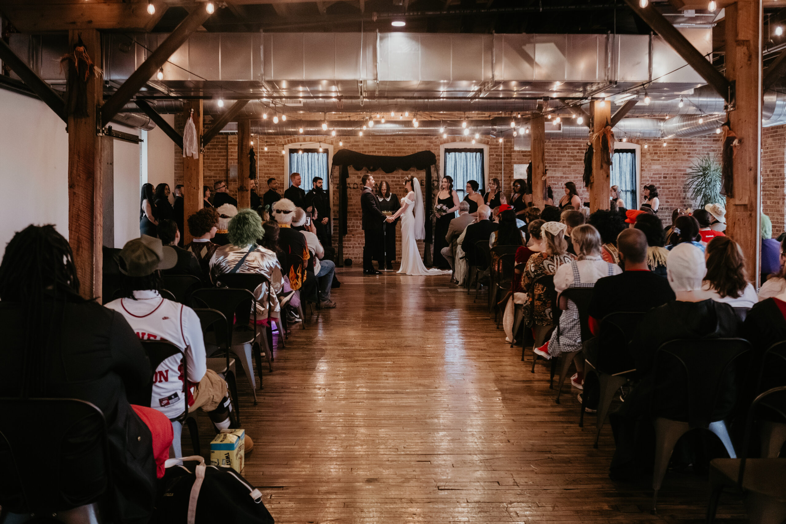 Elyse and Murphy’s Record Box Loft wedding in Battle Creek, Michigan was the perfect mix of eerie elegance and heartfelt celebration. Their romantic Halloween theme transformed the venue into a moody dream filled with candlelight, laughter, and love. Exposed brick, wooden beams, and string lights created an intimate setting where gothic charm met classic romance.