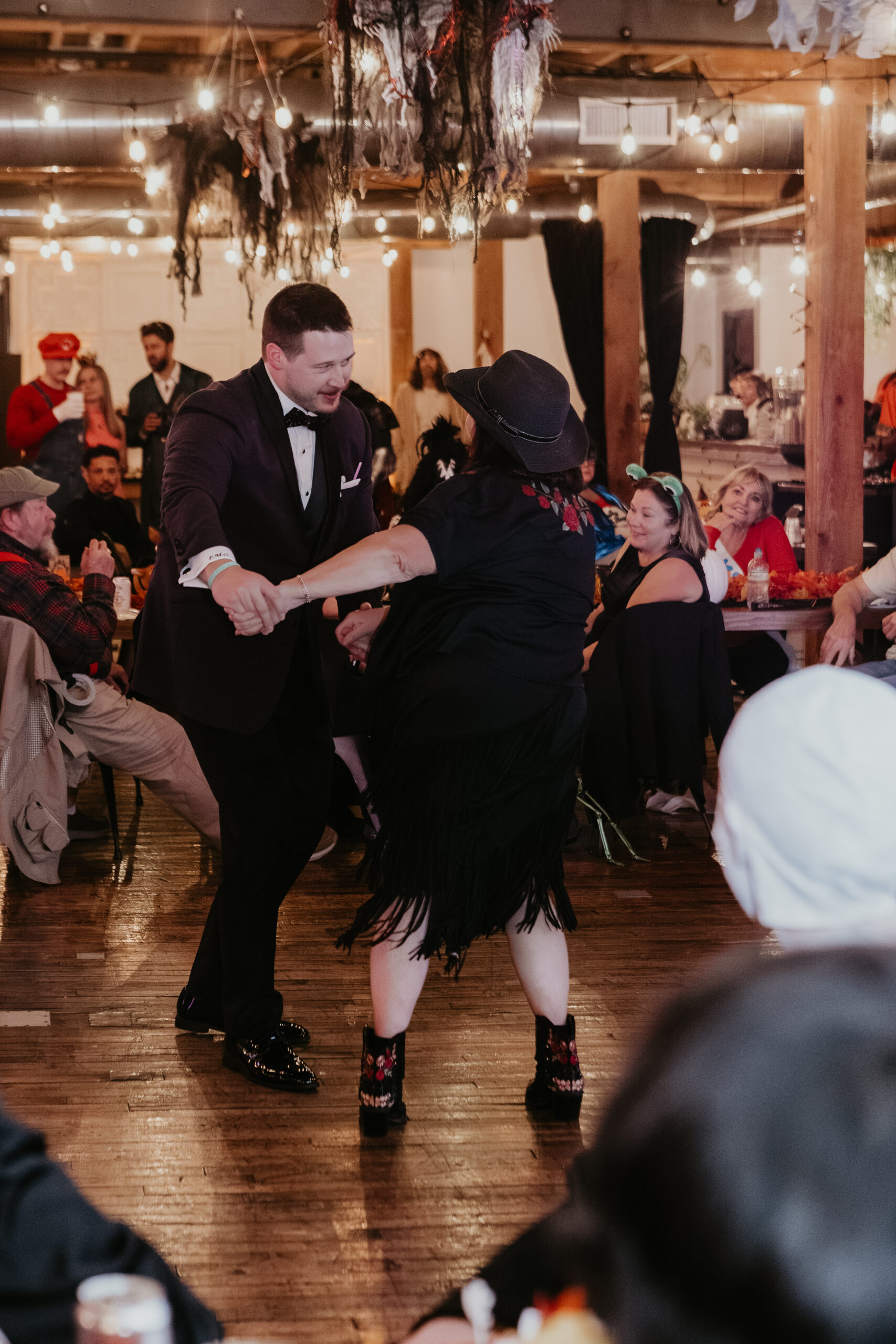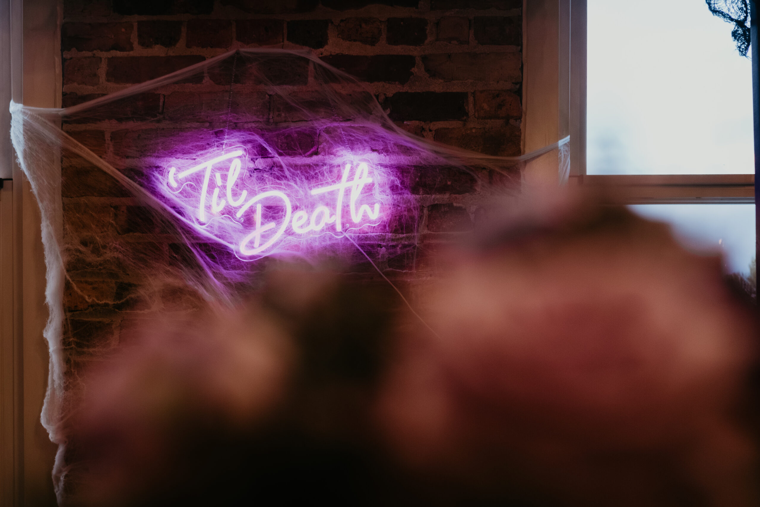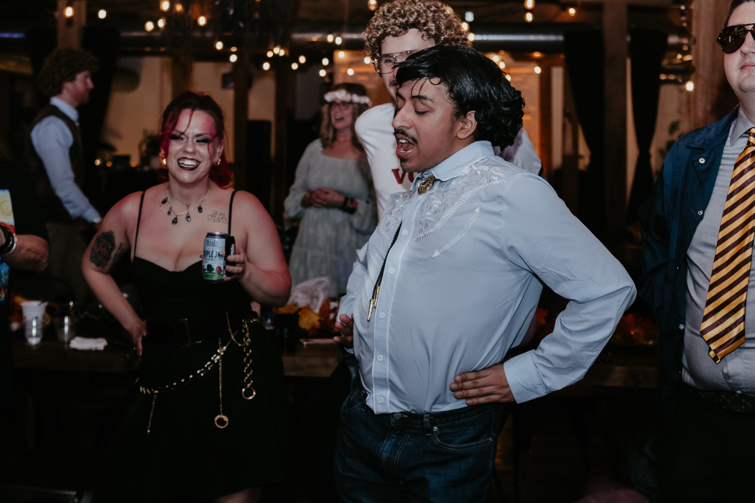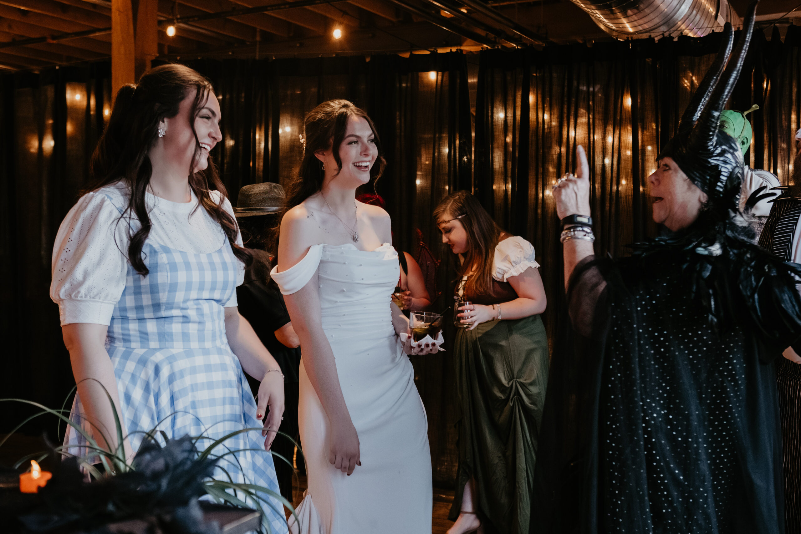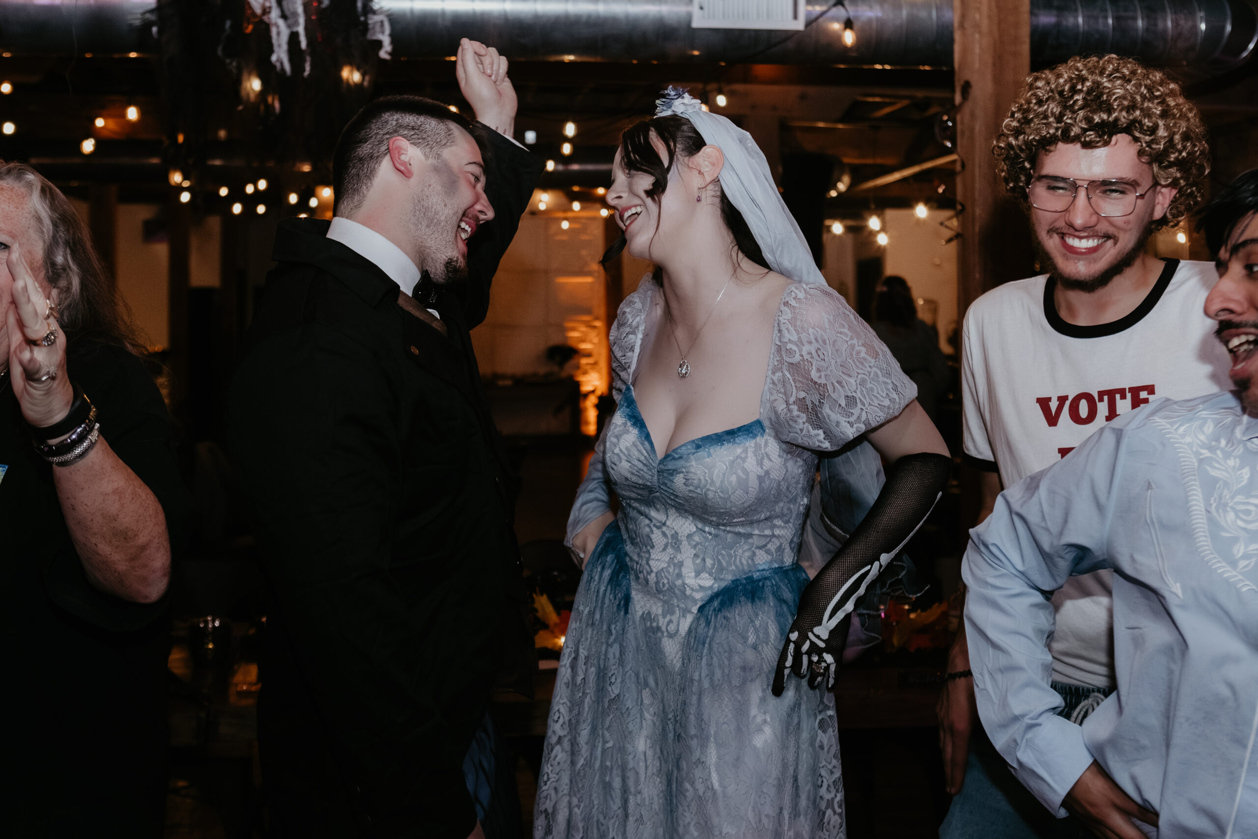 Their reception at Record Box Loft was a full celebration of personality and love. Guests arrived in costumes ranging from hilarious to haunting, turning the dance floor into a Halloween party unlike any other. The décor featured glowing neon signs, cobweb accents, and candlelit tables that made every detail feel intentional and cinematic.