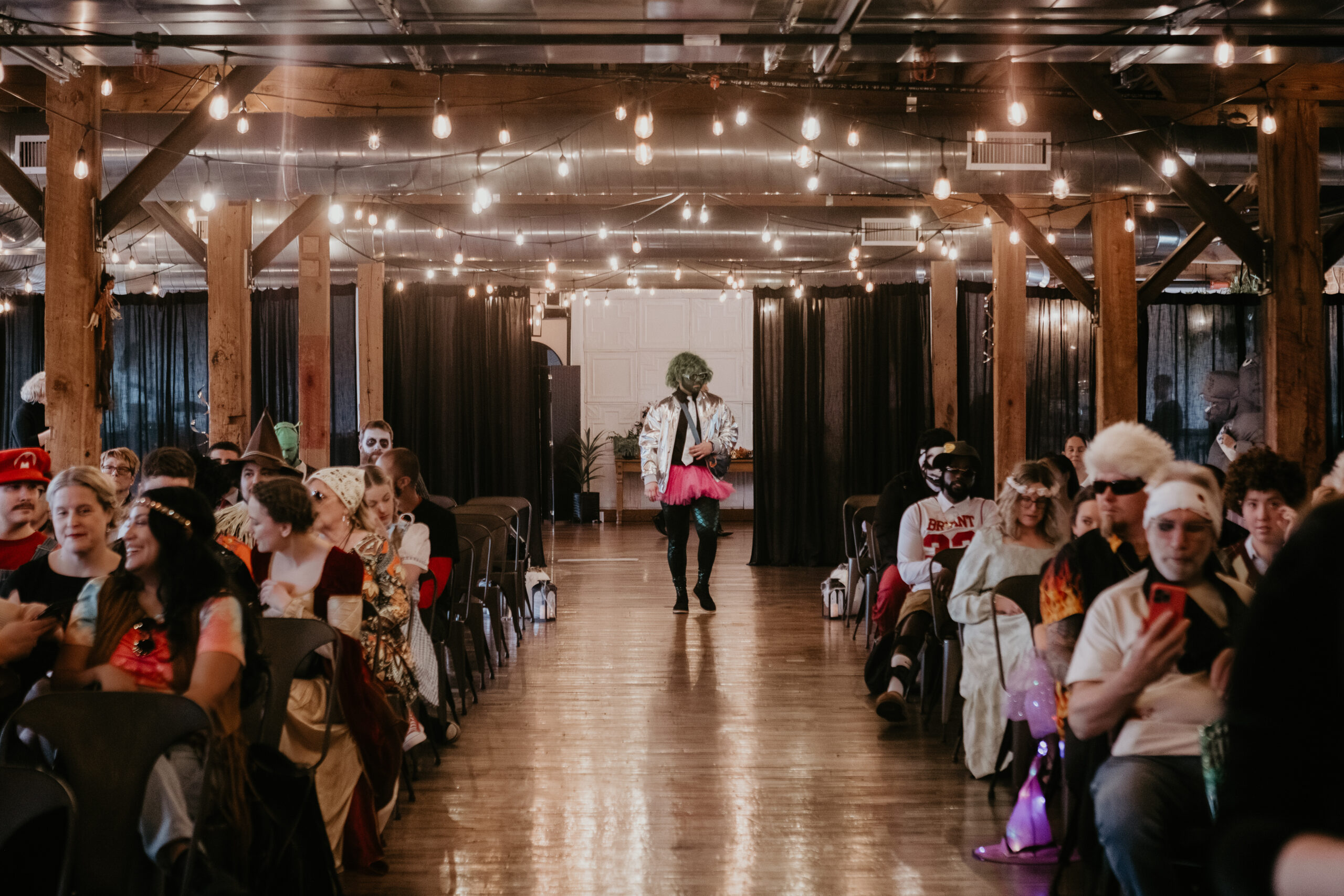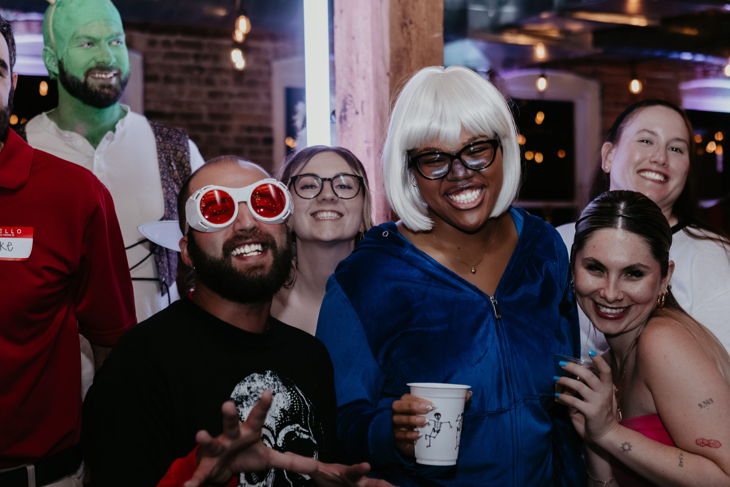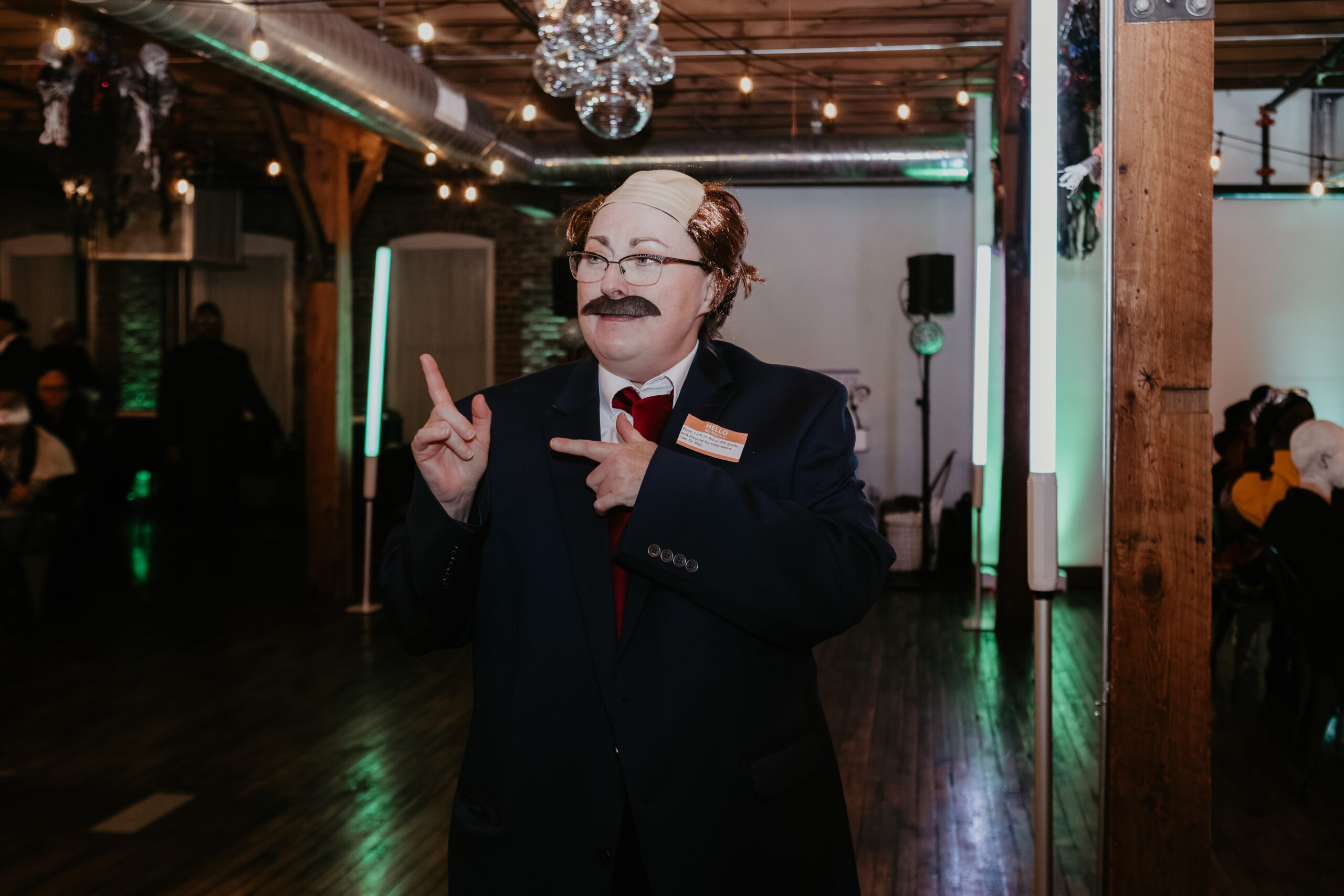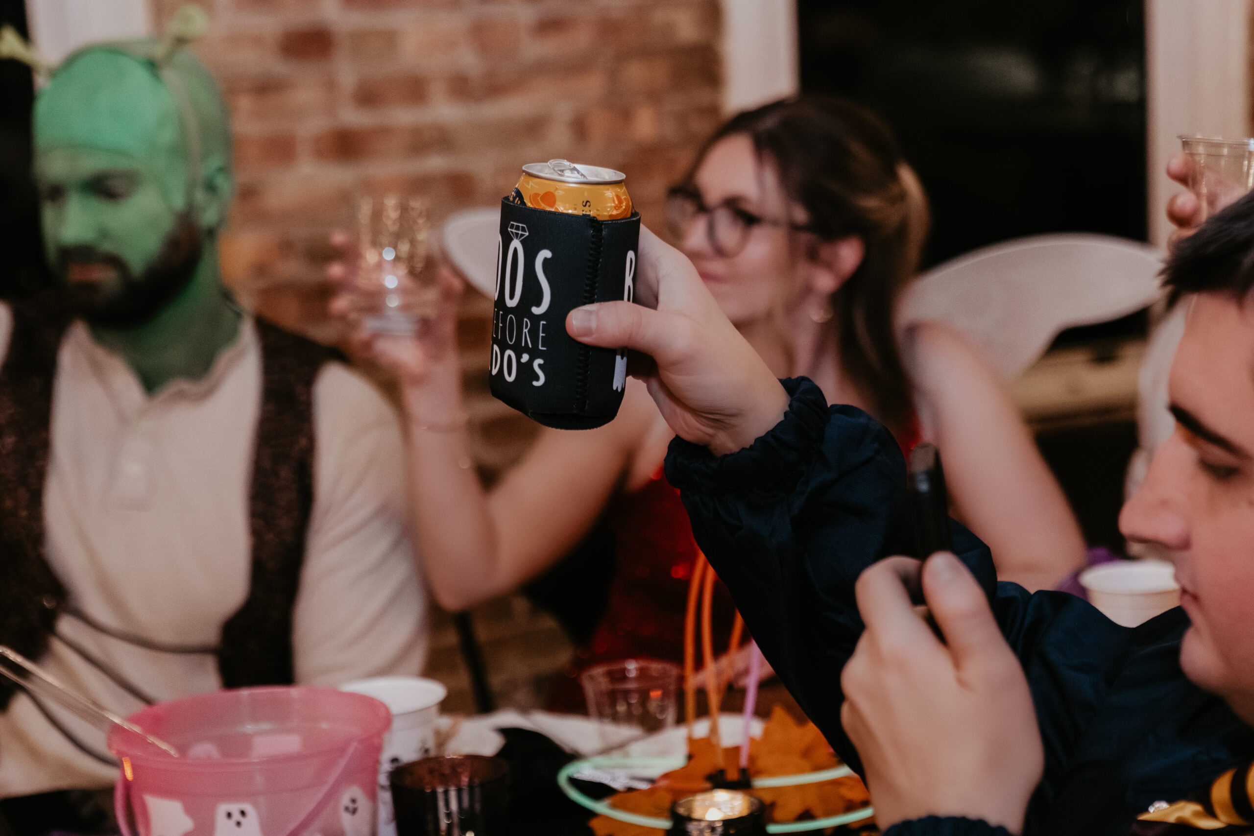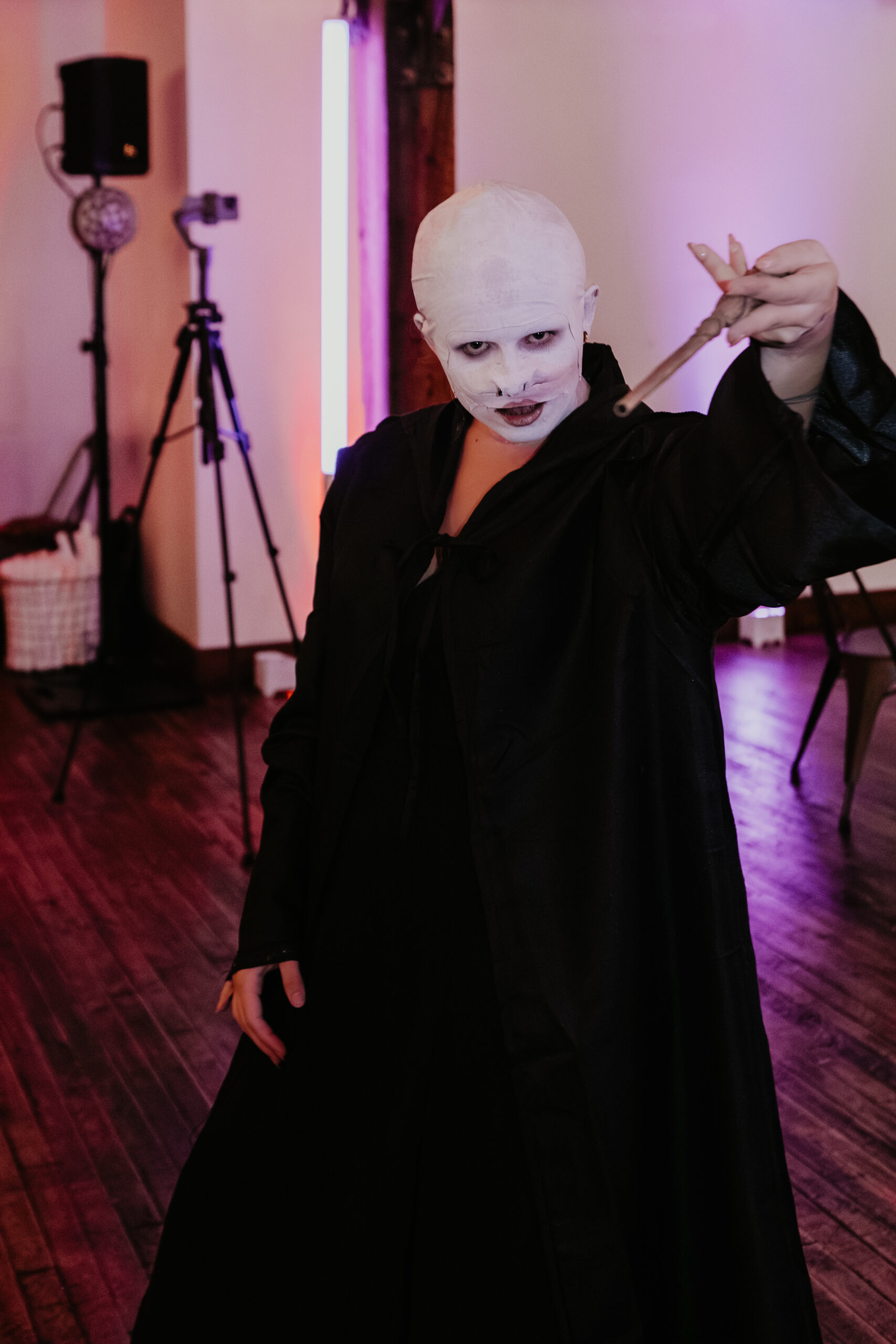 Their reception at Record Box Loft was a full celebration of personality and love. Guests arrived in costumes ranging from hilarious to haunting, turning the dance floor into a Halloween party unlike any other. The décor featured glowing neon signs, cobweb accents, and candlelit tables that made every detail feel intentional and cinematic.
